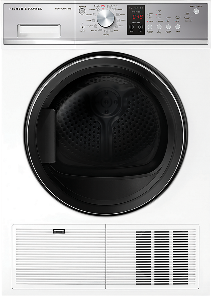 A perfect match for Fisher & Paykel’s front load washing machine, the 7-Star energy rated Heat Pump Dryer reuses the heated air, so there’s no need to vent moisture outside. Dry more laundry with greater peace of mind with the 8kg capacity and auto-sensing technology, whilst 13 drying programs means every garment can be effortlessly dried. The included drying rack ensures that even non-tumble items like shoes and toys can be dried with this Fisher & Paykel 8kg Heat Pump Dryer.