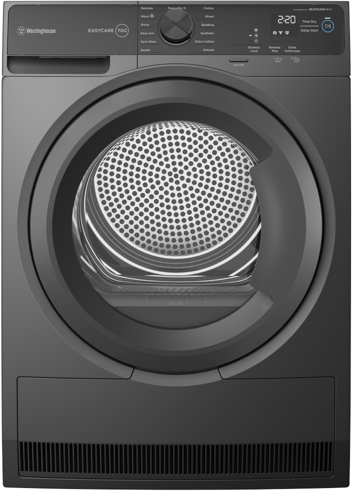 Elevate your laundry space with the sleek, modern aesthetic of the Westinghouse 9kg Heat Pump Dryer in Metallic Grey (WDH904N7SA). Its sophisticated design offers a stylish introduction to darker laundry styling, seamlessly blending form and function. Beyond its elegant appearance, this dryer boasts impressive efficiency, sporting an 8-Star Energy rating. With features like SenseDry Technology, 13 versatile drying programs, reverse tumbling, and an extra anti-crease option, it ensures effective drying while minimising ironing. This spacious and efficient 9kg dryer is perfect for any growing household, making laundry day a breeze.